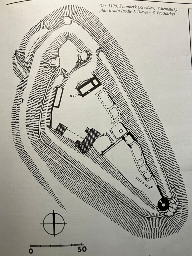 Osud Bohuslava VI. ze Švamberka se naplnil překvapivě hned z kraje roku 1421. V tu dobu působil Žižka spolu se svým spojencem, Petrem Zmrzlíkem ze Svojšína, na Plzeňsku. Petr Zmrzlík byl druhdy za Václava IV. kutnohorským mincmistrem, ale Zikmund ho z tohoto výnosného úřadu sesadil. Žižku zřejmě znal osobně z doby jeho působení v králově osobní stráži. Oba spojenci dobyli a vyplenili kláštery v Teplé, Chotěšově a Kladrubech. Dalším logickým cílem bylo královské město Stříbro. Sotva ale začalo obléhání, dostal Žižka zprávu, že jeho místní největší nepřítel, Bohuslav VI. ze Švamberka, se uchýlil na rodový hrad Švamberk (Krasíkov) pouze s nevelkou družinou. Této šance se husitský hejtman okamžitě chopil a přitáhl s vojskem ke Krasíkovu. Malá posádka hradu nebyla schopna zabránit dobytí mostu a branské věže hned prvním útokem. Pro představu přikládám půdorys Krasíkova, ze kterého je zřejmé, že takto rozlehlý hrad by musela hájit opravdu početná posádka, aby obstál při útoku silného vojska.