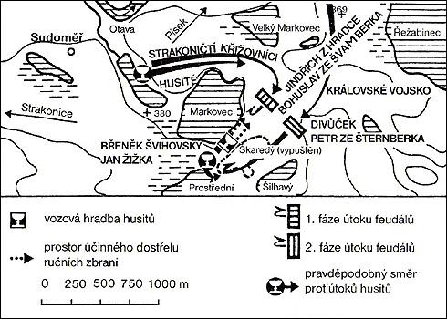 Obrannou pozici husité zvolili na hrázi mezi rybníky Markovec a Škaredý, kterou zahradili svými vozy. Malá výšina, na které je nyní pomník Jana Žižky, byla zřejmě součástí obranných pozic. Ve středověku za tímto návrším směrem na západ byly bažiny, takže terén zcela neprostupný pro tehdejší vojska. Úzká šíje hráze zamezila možnosti širokého útoku jízdy a zpomalila ji tak, že útok ztratil razanci a k vozové hradbě bojovníci dorazili de facto krokem.