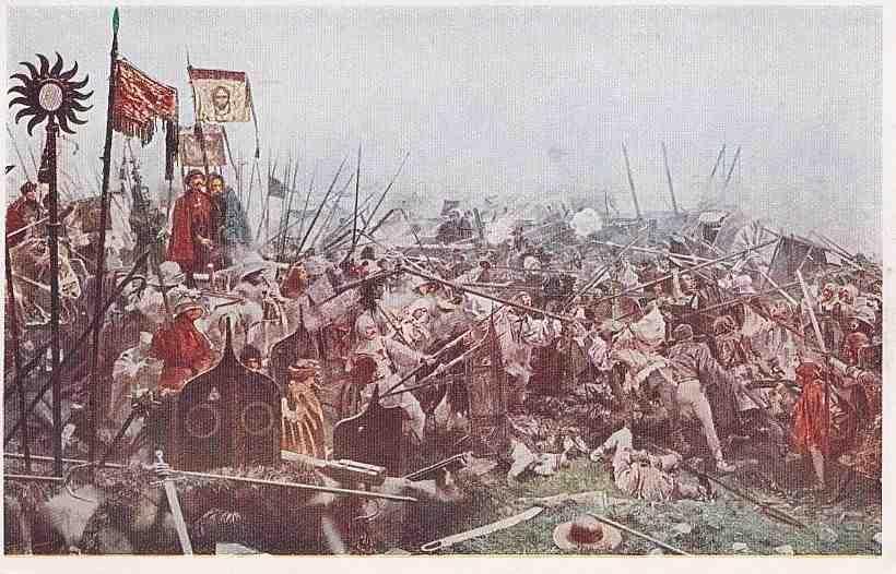 Po ukončení jednání, kdy jeden z účastníků lakonicky poznamenal „Tak a teď rozhodnou pěsti!“, se obě vojska uzavřela ve svých vozových hradbách. Radikálové zahájili palbu z děl. Ta ale nemohla nijak protistraně uškodit, ale vyvolala mezi tamními vojáky nespokojenost se situací, kdy by se měli nechat jen tak ostřelovat. Padne rozhodnutí a radikálové pozorují, jak jejich protivník otevírá vozovou hradbu, ze které vyráží početný oddíl pěších k útoku.